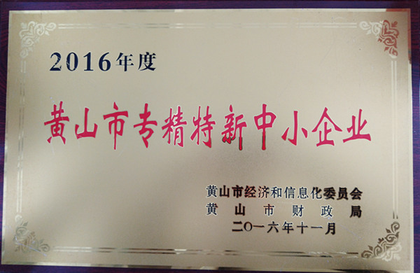 公司2016年十一月被認(rèn)定為黃山市專精特新中小企業(yè)。