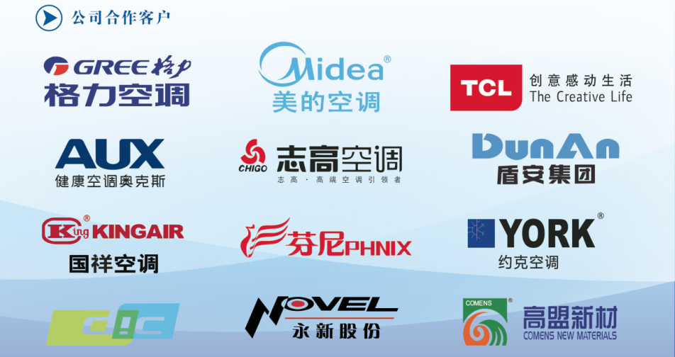 天馬鋁業與格力、美的、TCL、志高、盾安、國祥空調、約克空調、芬尼克茲熱泵、永新股份、高盟新材等客戶建立了良好合作關系,并先后榮獲了“ TCL戰略合作伙伴”、“志高公司優秀供應商”等榮譽稱號。